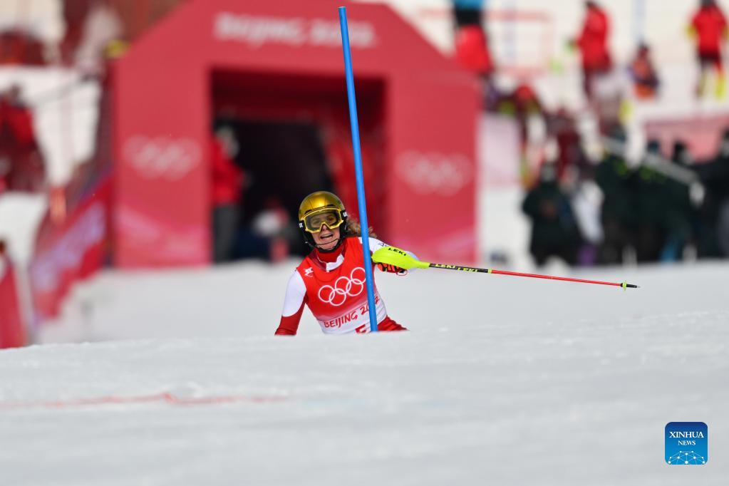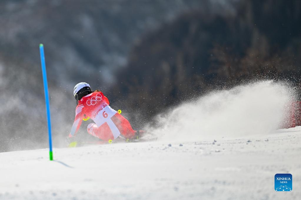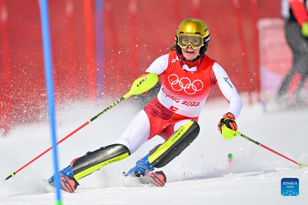 Katharina Liensberger of Austria competes during Alpine Skiing women's slalom of the Beijing 2022 Winter Olympics at the National Alpine Skiing Centre in Yanqing District, Beijing, capital of China, Feb. 9, 2022. (Xinhua/Chen Yichen)