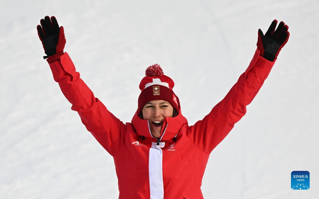 Bronze medalist Wendy Holdener of Switzerland reacts during the awarding ceremony of alpine skiing women's slalom at the National Alpine Skiing Centre in Yanqing District, Beijing, capital of China, Feb. 9, 2022. (Xinhua/Lian Zhen)