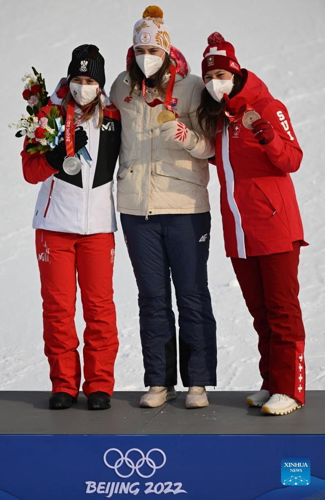 Silver medalist Katharina Liensberger of Austria, Gold medalist Petra Vlhova of Slovakia and Bronze medalist Wendy Holdener of Switzerland (from L ro R) pose for photos during the awarding ceremony of alpine skiing women's slalom at the National Alpine Skiing Centre in Yanqing District, Beijing, capital of China, Feb. 9, 2022. (Xinhua/Lian Zhen)