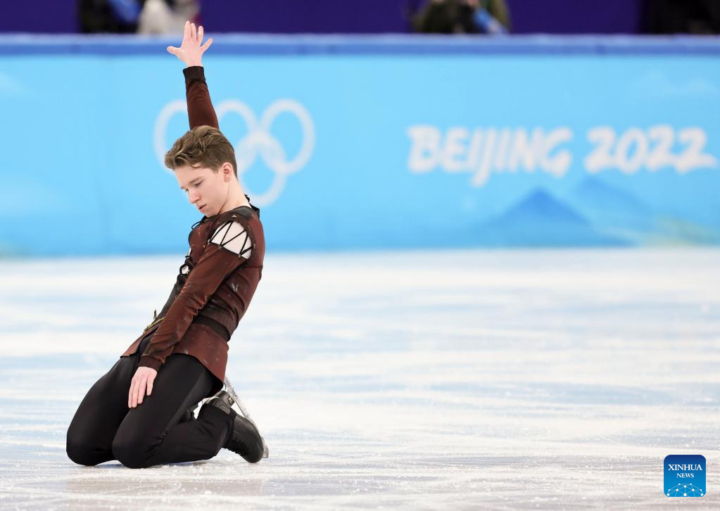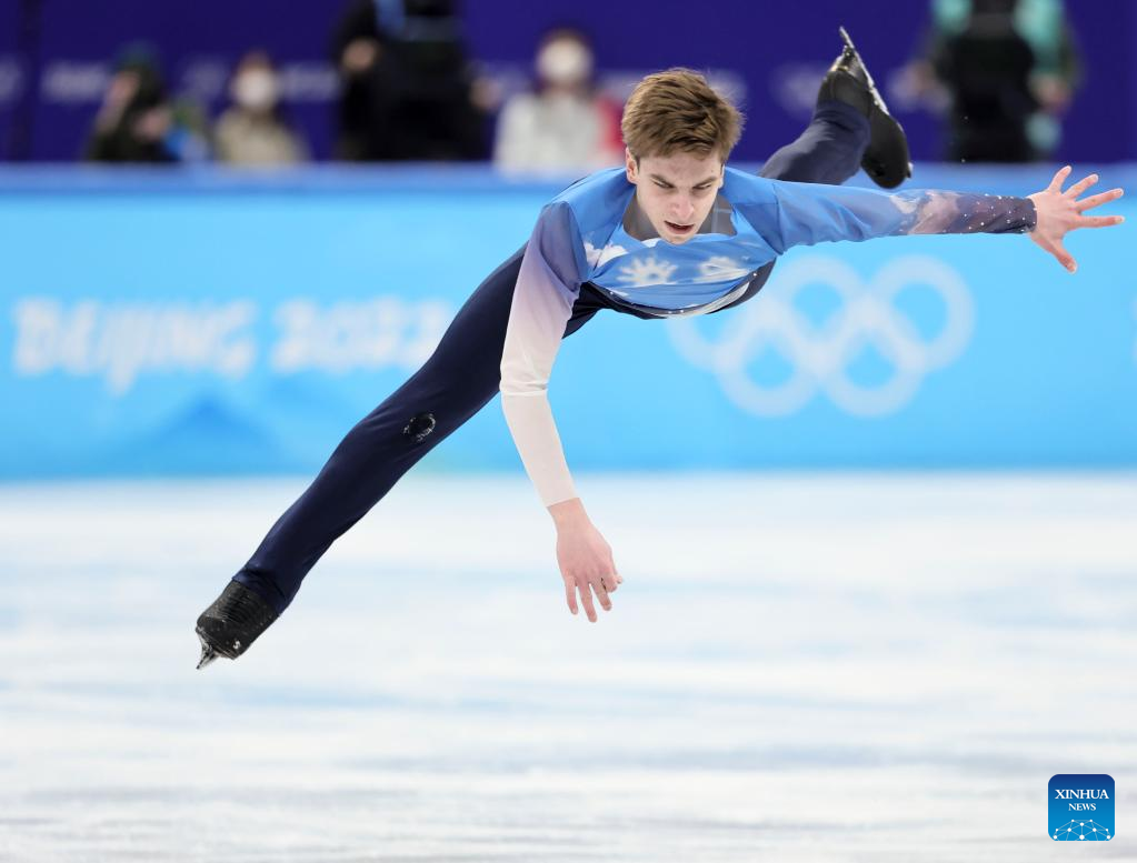 Ivan Shmuratko of Ukraine performs during the figure skating men single skating free skating match of Beijing 2022 Winter Olympics at Capital Indoor Stadium in Beijing, capital of China, Feb. 10, 2022. (Xinhua/Lan Hongguang)