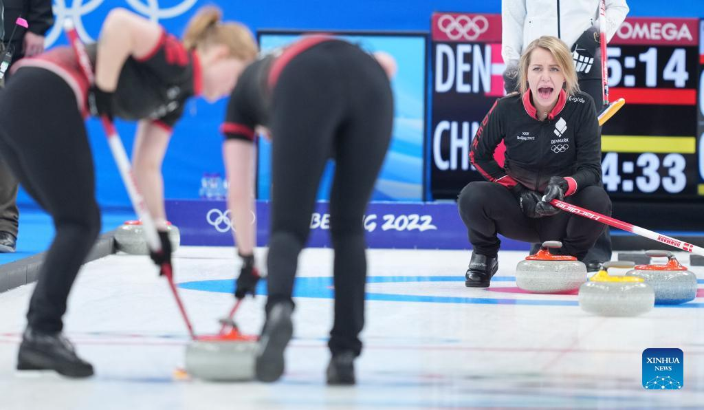 Madeleine Dupont (R) of Denmark competes during the Curling Women's Round Robin Session 1 of the Beijing 2022 Winter Olympics between China and Denmark at the National Aquatics Centre in Beijing, capital of China, Feb. 10, 2022. (Xinhua/Zhou Mi)
