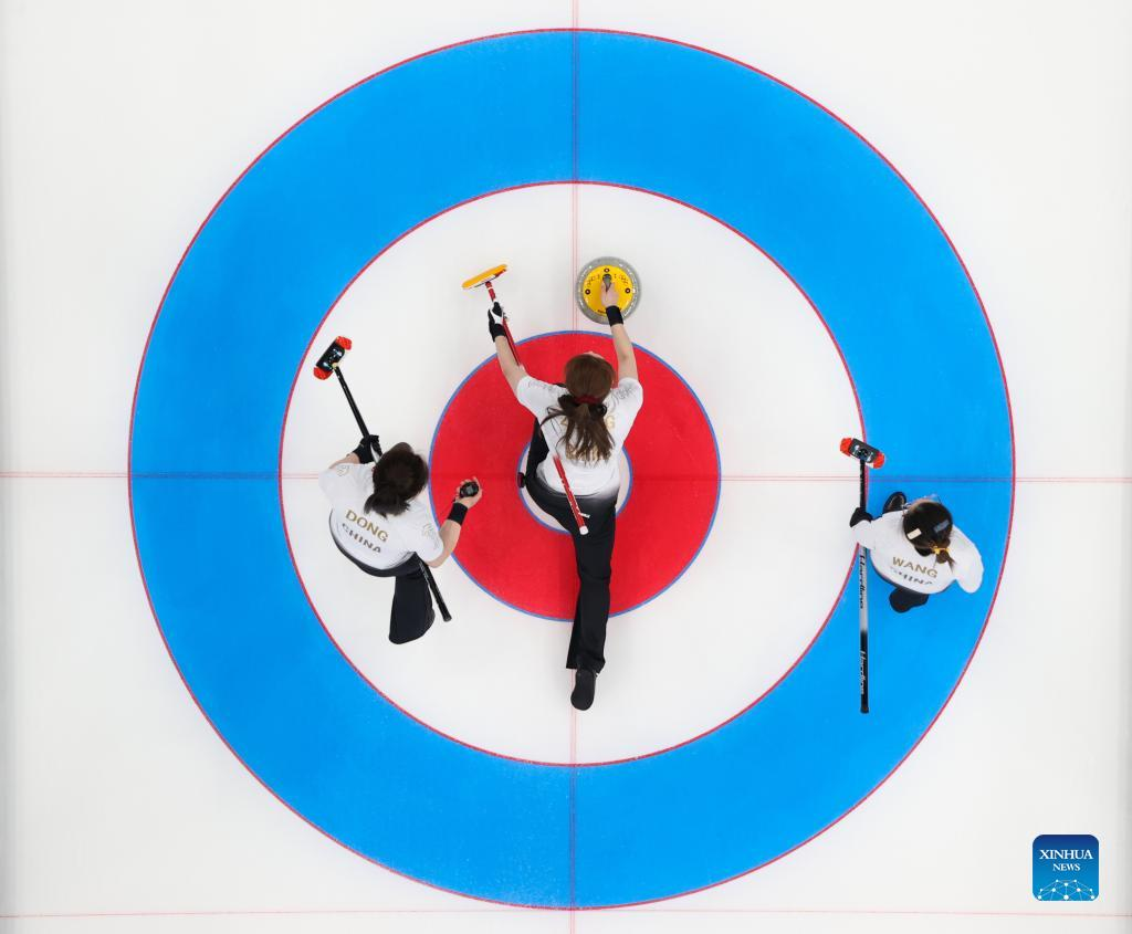 Dong Ziqi (L), Zhang Lijun (C) and Wang Rui of China compete during the Curling Women's Round Robin Session 1 of the Beijing 2022 Winter Olympics between China and Denmark at the National Aquatics Centre in Beijing, capital of China, Feb. 10, 2022. (Xinhua/Wang Jingqiang)