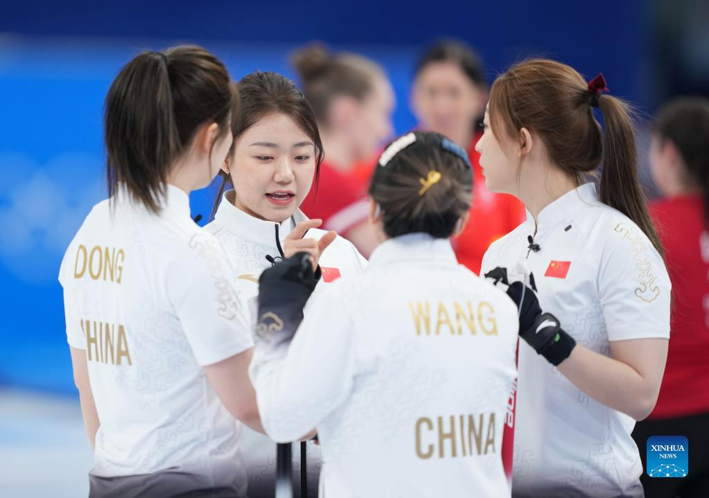 Han Yu (2nd L), Wang Rui (3rd L), Dong Ziqi (1st L) and Zhang Lijun of China react during the Curling Women's Round Robin Session 1 of the Beijing 2022 Winter Olympics between China and Denmark at the National Aquatics Centre in Beijing, capital of China, Feb. 10, 2022. (Xinhua/Zhou Mi)