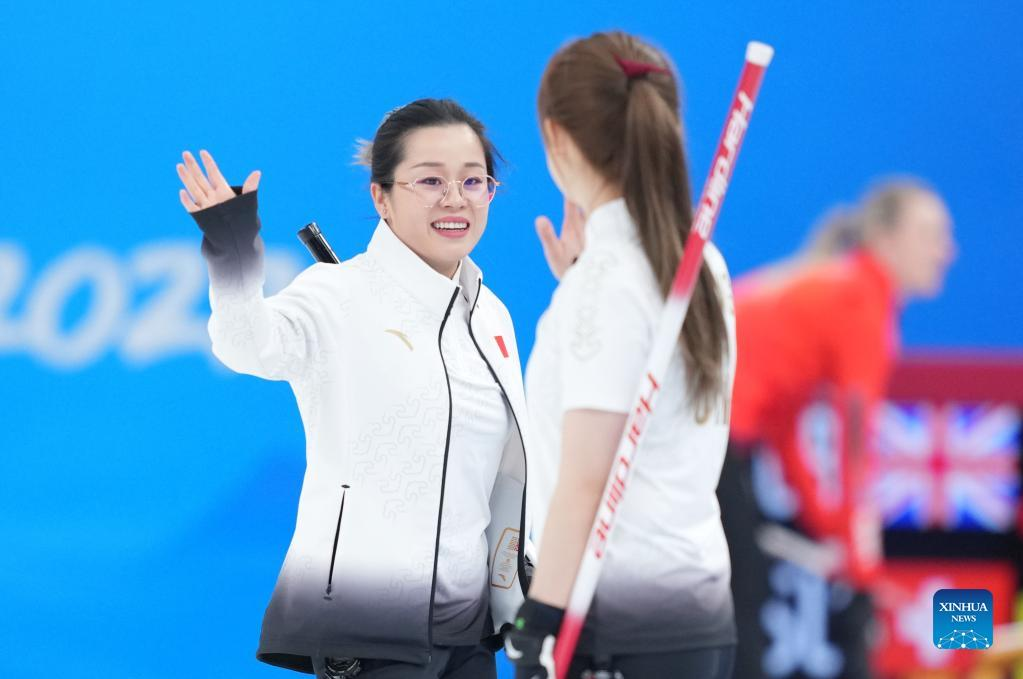 Han Yu (R) of China competes during the Curling Women's Round Robin Session 1 of the Beijing 2022 Winter Olympics between China and Denmark at the National Aquatics Centre in Beijing, capital of China, Feb. 10, 2022. (Xinhua/Zhou Mi)