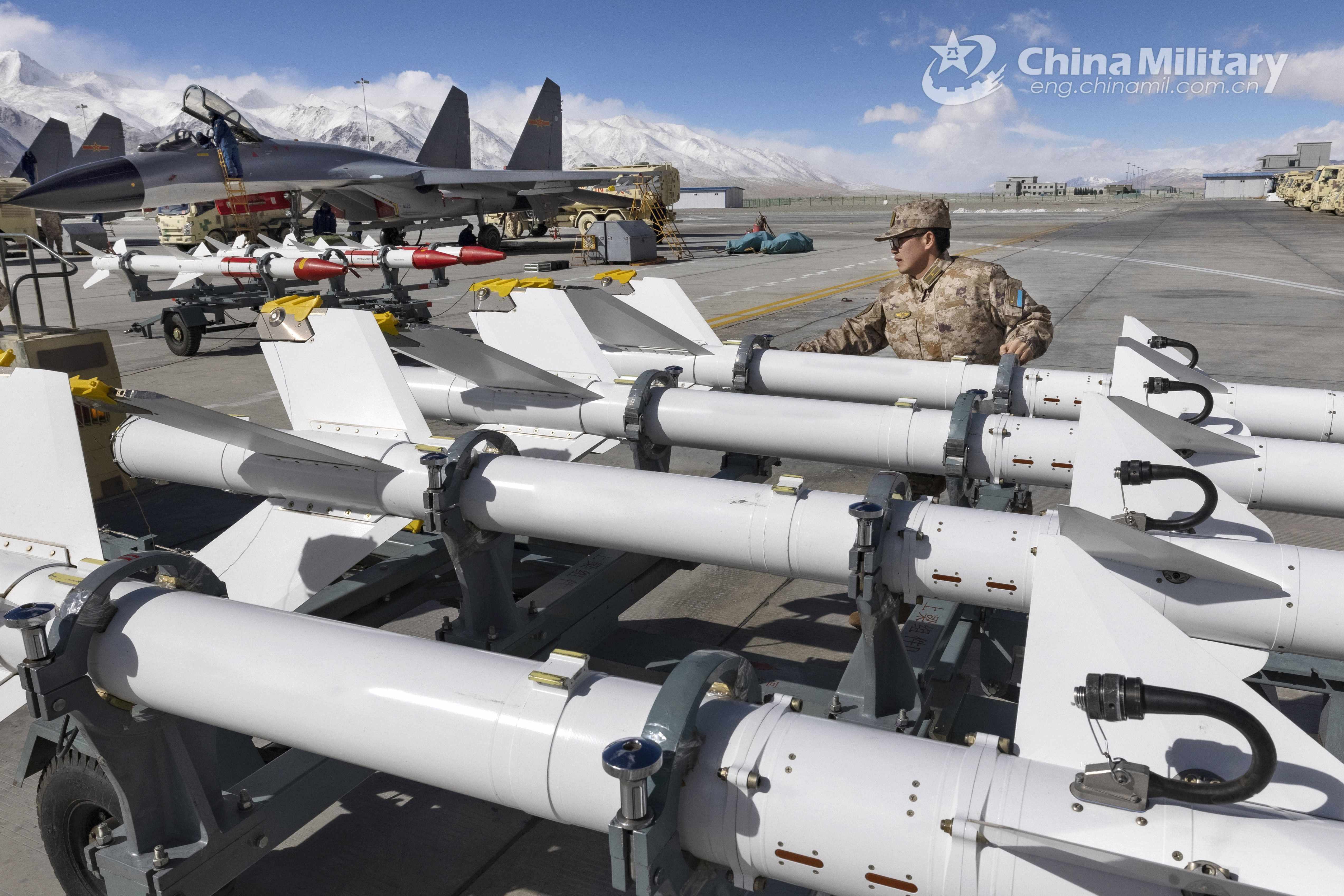 An ordnance technician assigned to an aviation brigade with the air force under the PLA Western Theater Command is fixing missiles to a transportation vehicle during an emergency support exercise held at a high-altitude aerodrome in late January, 2022. (eng.chinamil.com.cn/Photo by Liu Chang and Yu Chao)