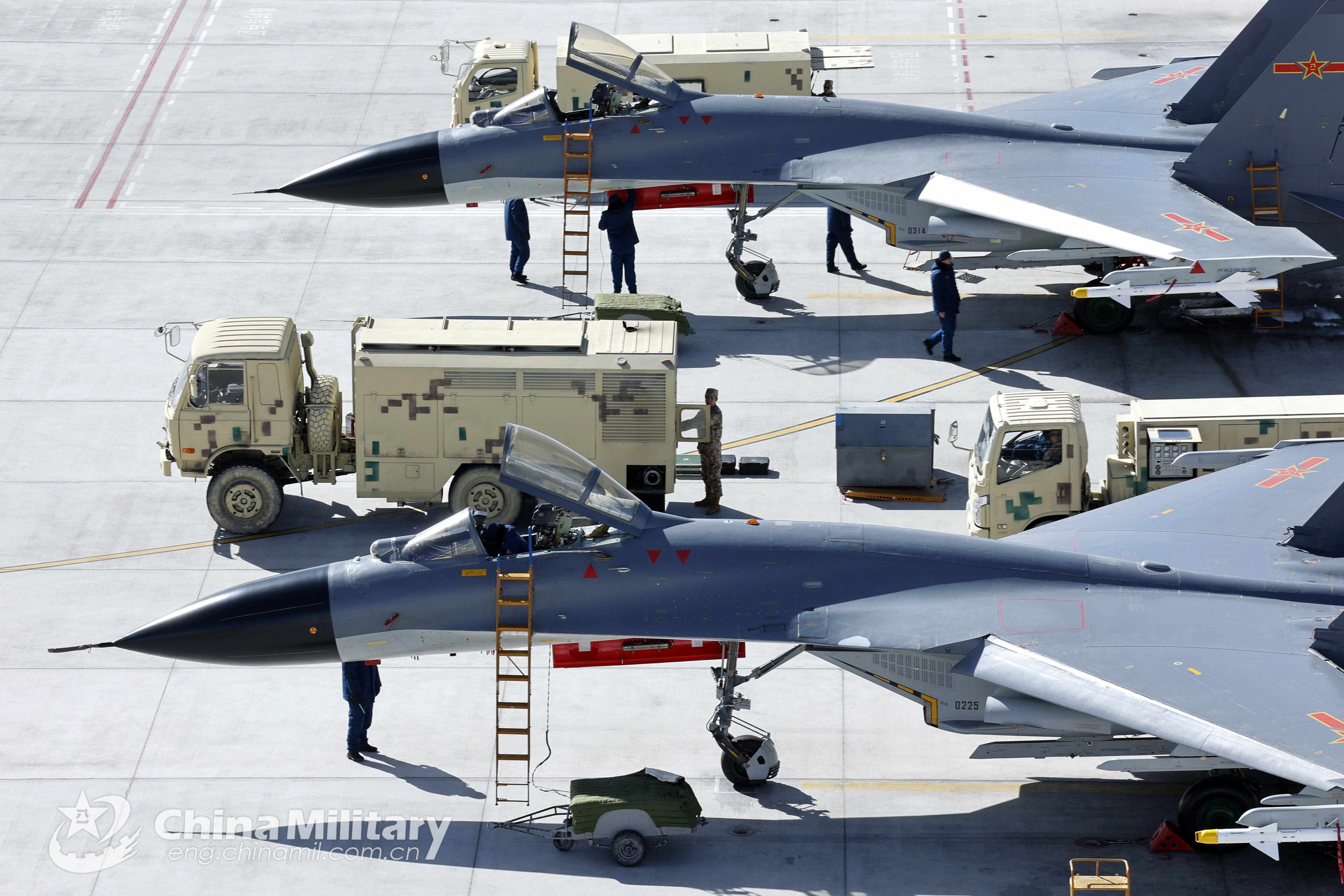 J-11 fighter jets get well prepared thanks to the work of the ground crew assigned to an aviation brigade with the air force under the PLA Western Theater Command during an emergency support exercise held at a high-altitude aerodrome in late January, 2022. (eng.chinamil.com.cn/Photo by Liu Chang and Yu Chao)