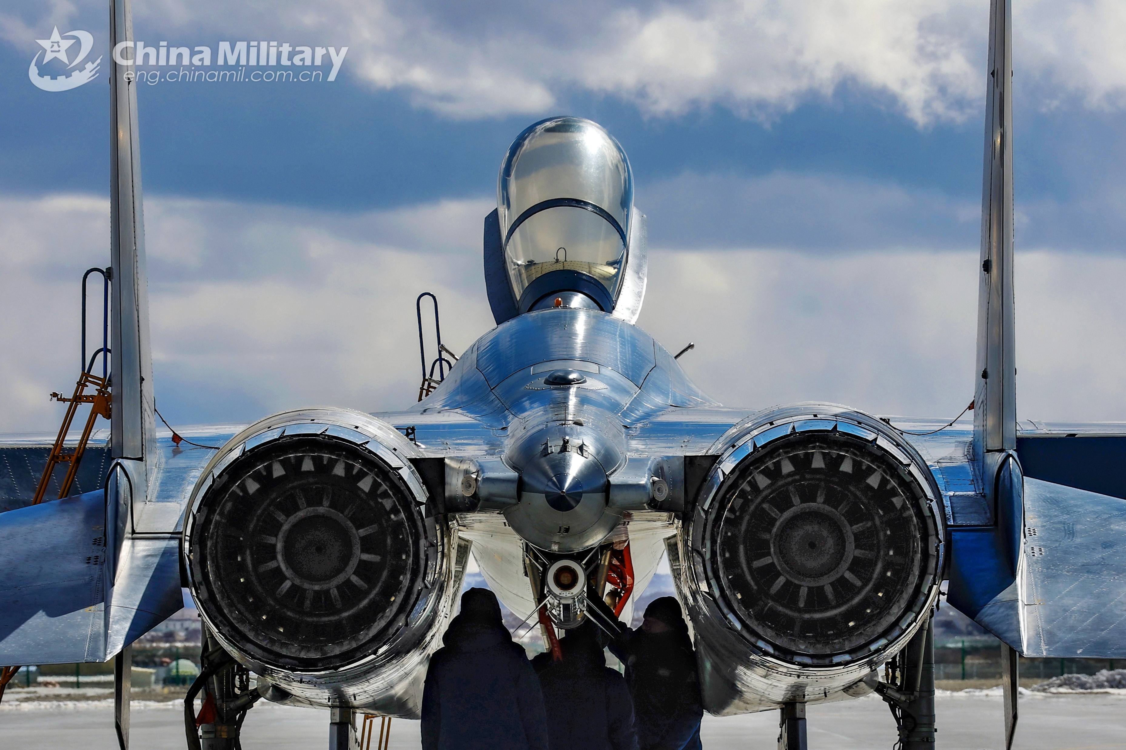 Ground crew assigned to an aviation brigade with the air force under the PLA Western Theater Command are carefully inspecting a J-11 fighter jet and its pylon during an emergency support exercise held at a high-altitude aerodrome in late January, 2022. (eng.chinamil.com.cn/Photo by Liu Chang and Yu Chao)