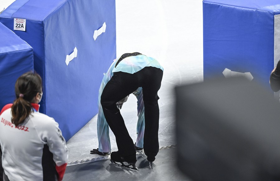 Yuzuru Hanyu (R) of Japan touches the ice before leaving after his performance during the figure skating men single skating free skating of the Beijing 2022 Winter Olympics at Capital Indoor Stadium in Beijing on Feb. 10, 2022. (Xinhua/Li Ga)