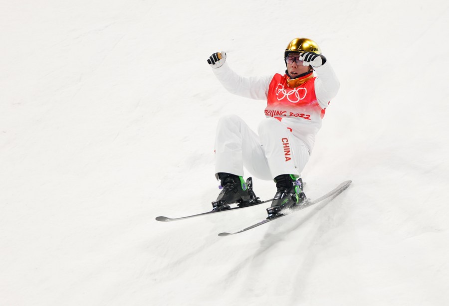Jia Zongyang of China competes during the freestyle skiing mixed team aerials final at Genting Snow Park in Zhangjiakou, north China's Hebei Province on Feb. 10, 2022. (Xinhua/Fei Maohua)