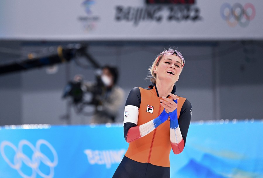 Irene Schouten of the Netherlands reacts after the speed skating women's 5,000m event at the National Speed Skating Oval in Beijing on Feb. 10, 2022. (Xinhua/Wang Fei)