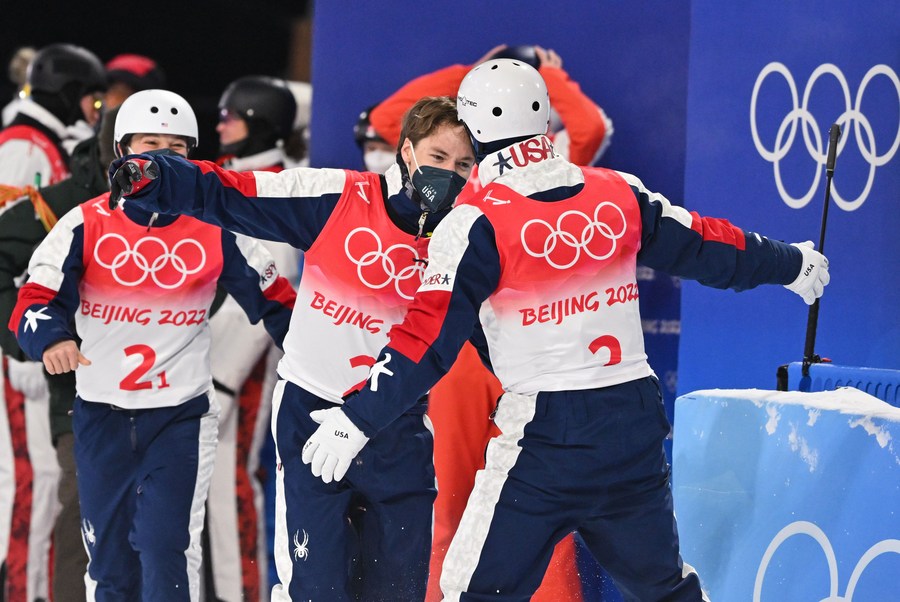 U.S. skiers celebrate after winning the freestyle skiing mixed team aerials final at Genting Snow Park in Zhangjiakou, north China's Hebei Province on Feb. 10, 2022. (Xinhua/Zhu Zheng)