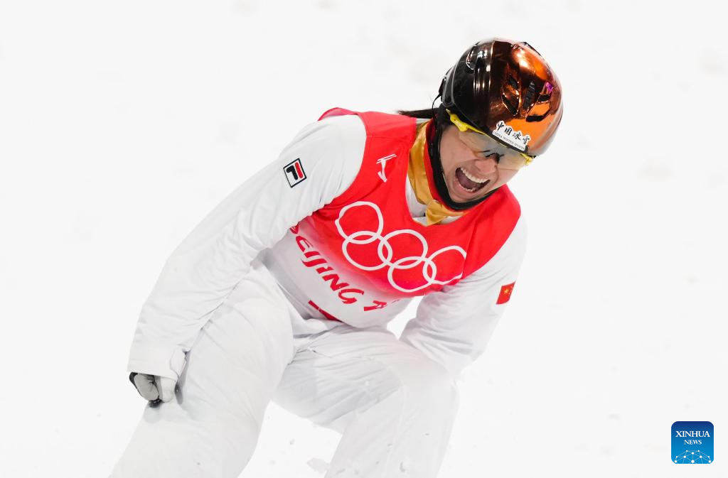 Xu Mengtao of China reacts during the freestyle skiing mixed team aerials final at Genting Snow Park in Zhangjiakou, north China's Hebei Province, Feb. 10, 2022. (Xinhua/Zhu Zheng)