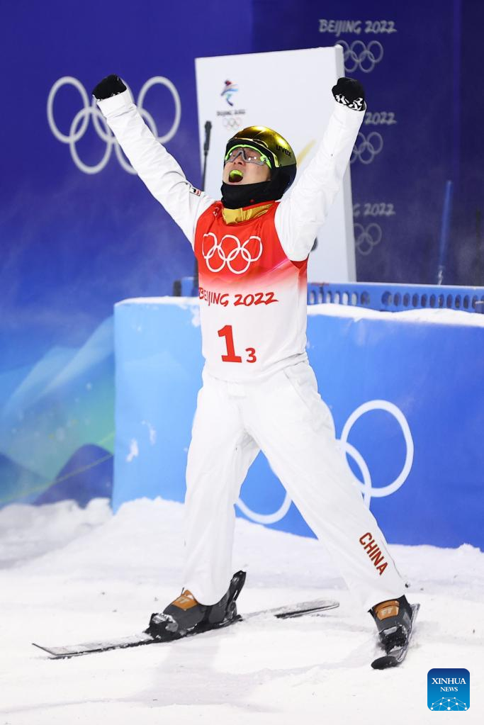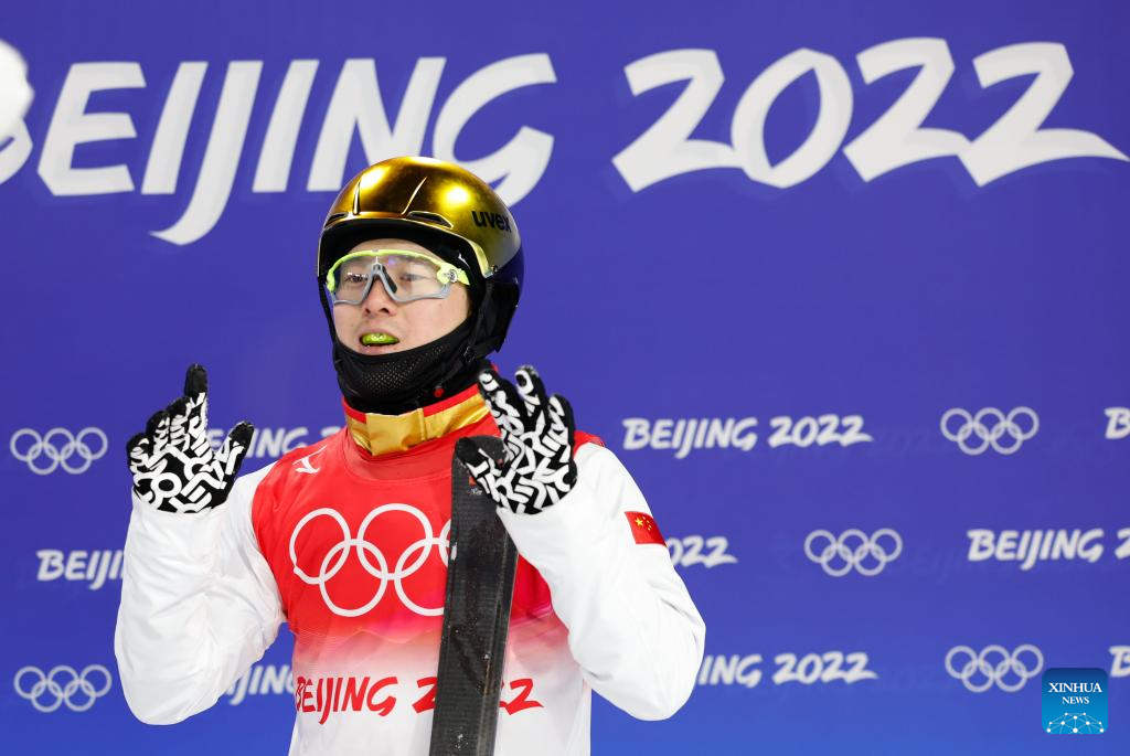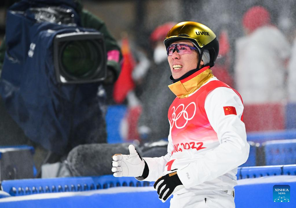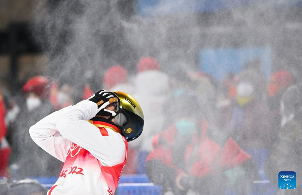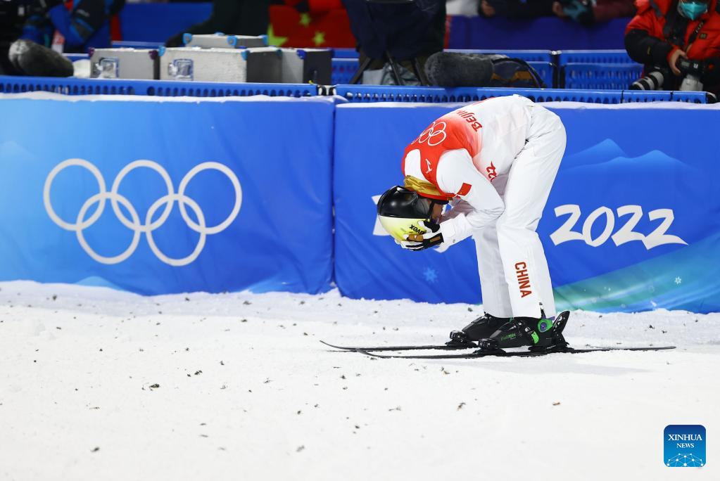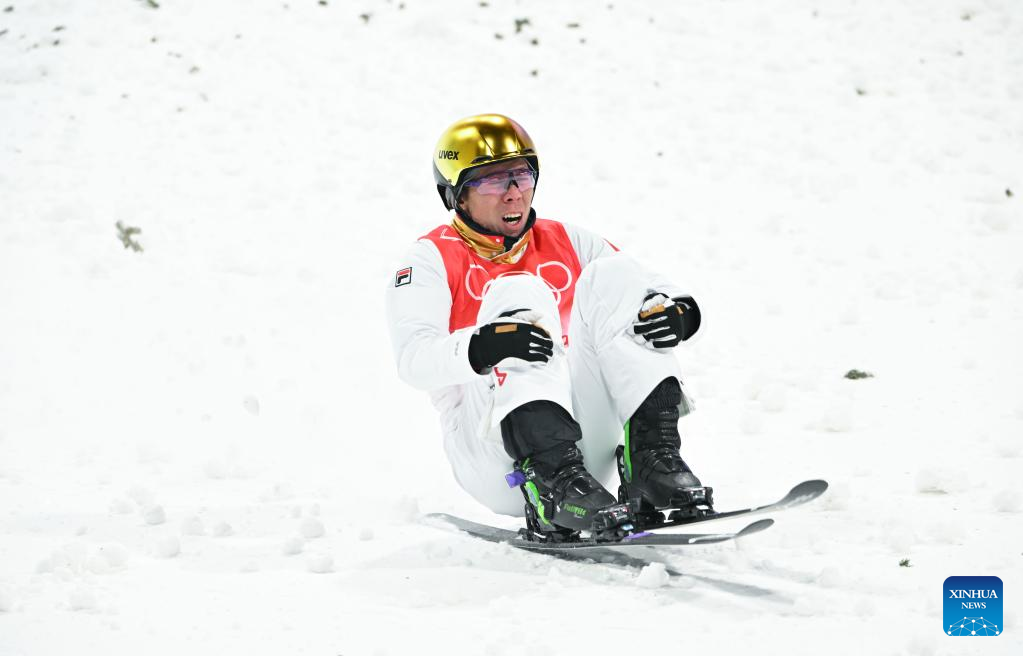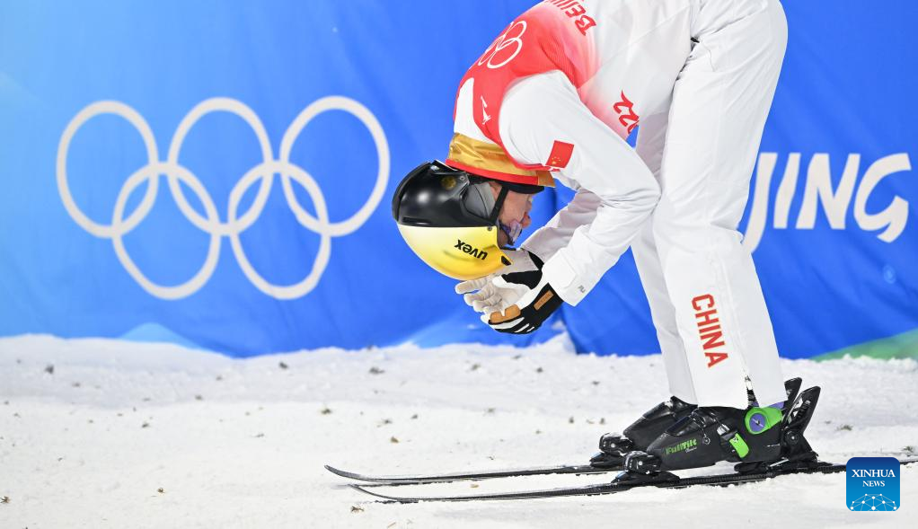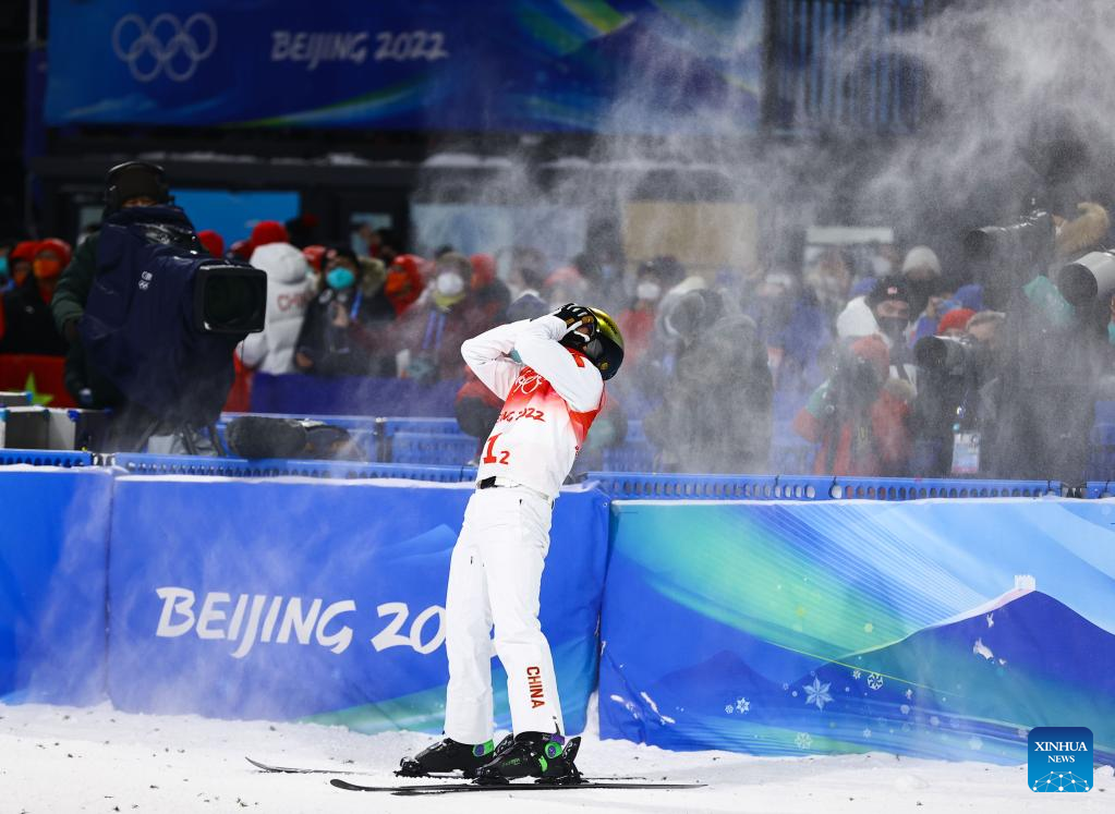 Qi Guangpu of China reacts during during the freestyle skiing mixed team aerials final at Genting Snow Park in Zhangjiakou, north China's Hebei Province, Feb. 10, 2022. (Xinhua/Wu Zhuang)