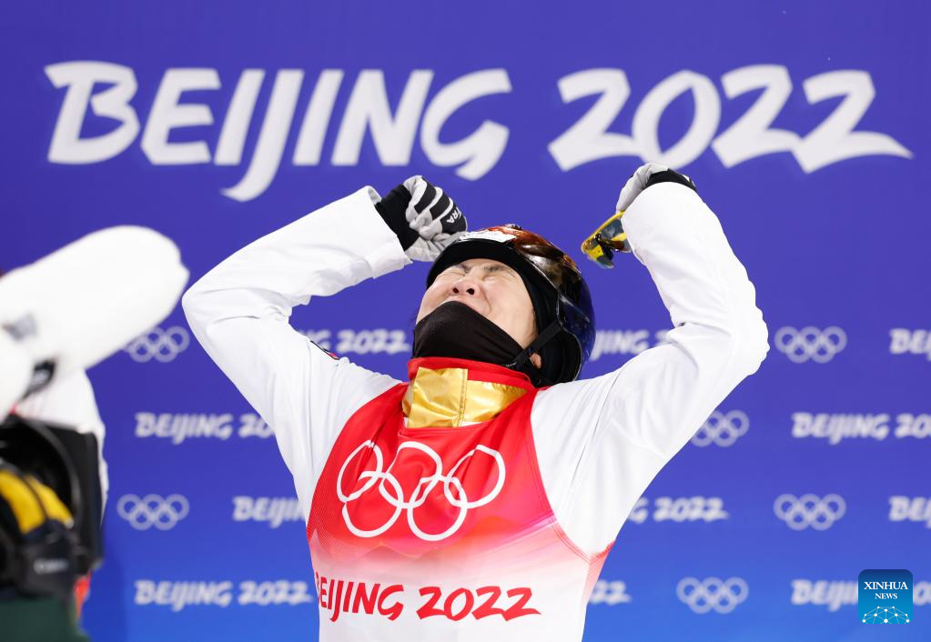 Xu Mengtao of China reacts during the freestyle skiing mixed team aerials final at Genting Snow Park in Zhangjiakou, north China's Hebei Province, Feb. 10, 2022. (Xinhua/Fei Maohua)