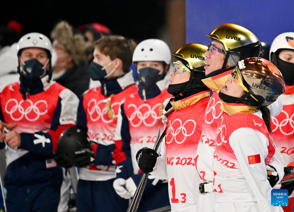 Team of China (R)and Team of the United States react after the freestyle skiing mixed team aerials final at Genting Snow Park in Zhangjiakou, north China's Hebei Province, Feb. 10, 2022. (Xinhua/Fei Maohua)