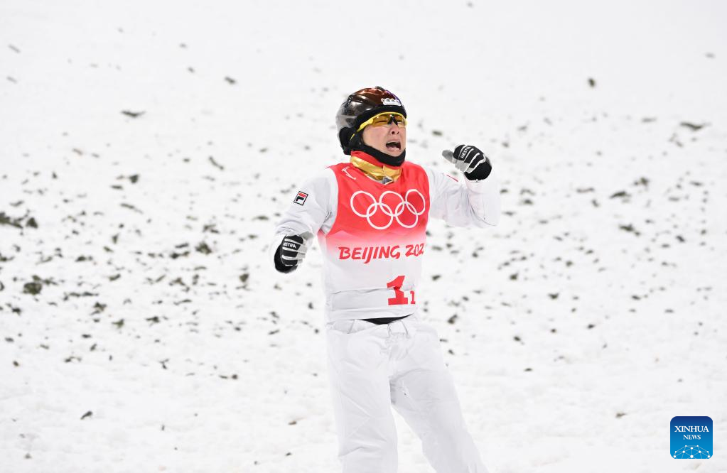 Qi Guangpu of China reacts during the freestyle skiing mixed team aerials final at Genting Snow Park in Zhangjiakou, north China's Hebei Province, Feb. 10, 2022. (Xinhua/Xiao Yijiu)