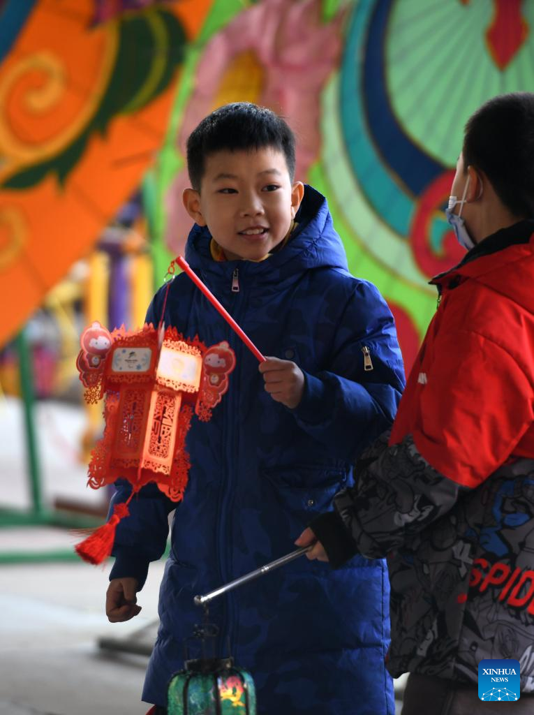 Children hold lanterns at a lantern making center in Gaocheng District of Shijiazhuang, north China's Hebei Province, Feb. 10, 2022. (Photo by Xu Jianyuan/Xinhua)