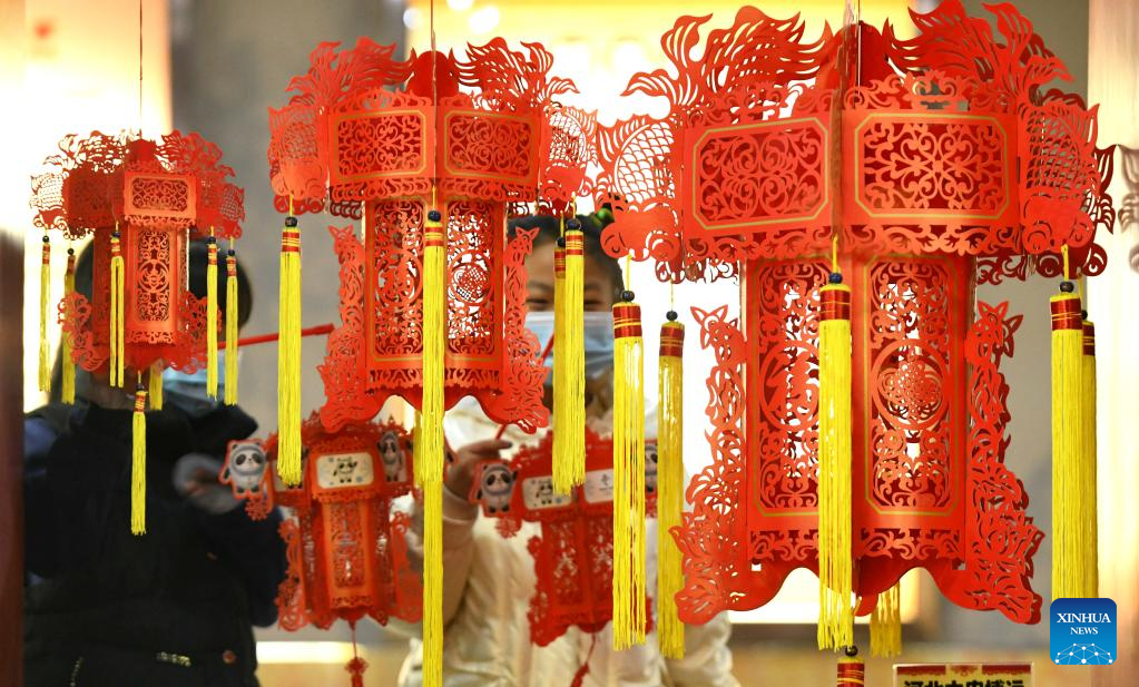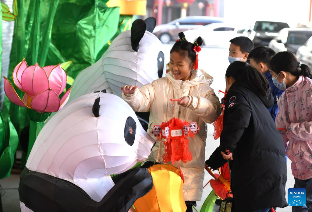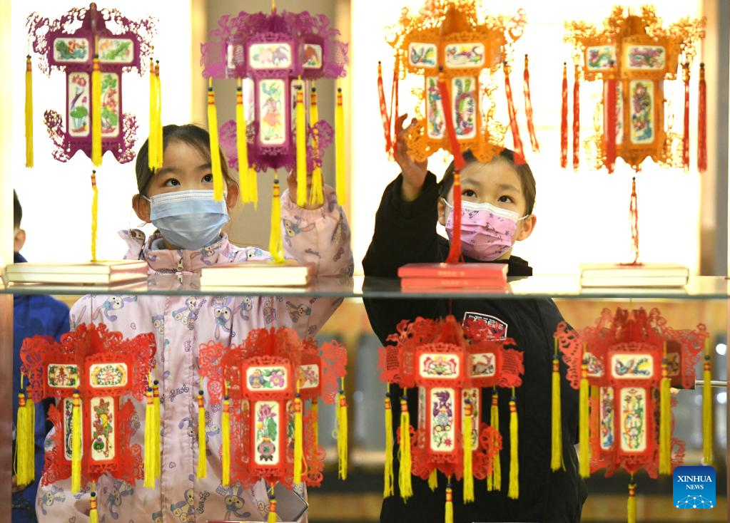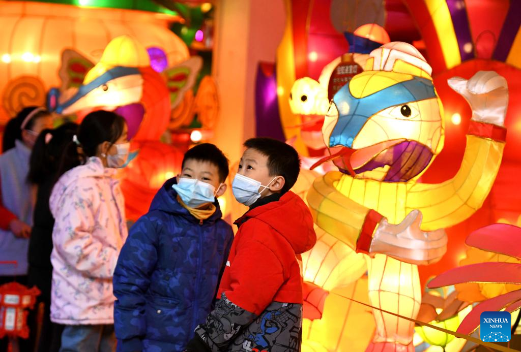 Children view lanterns at a lantern making center in Gaocheng District of Shijiazhuang, north China's Hebei Province, Feb. 10, 2022. (Photo by Xu Jianyuan/Xinhua)