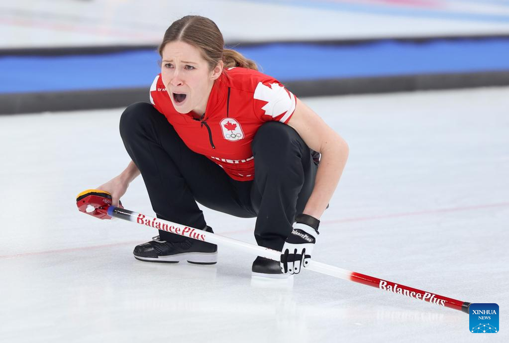 Kaitlyn Lawes of Canada creacts competes during the Curling Women's Round Robin Session 2 of the Beijing 2022 Winter Olympics between Canada and Republic of Korea at the National Aquatics Centre in Beijing, capital of China, Feb. 10, 2022. (Xinhua/Wang Jingqiang)