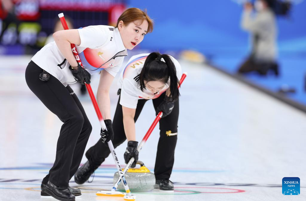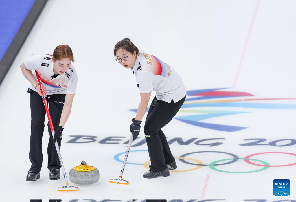 Kim ChoHi (L) of Republic of Korea and her teammate Kim SeonYeong competes during the Curling Women's Round Robin Session 2 of the Beijing 2022 Winter Olympics between Canada and Republic of Korea at the National Aquatics Centre in Beijing, capital of China, Feb. 10, 2022. (Xinhua/Wang Jingqiang)