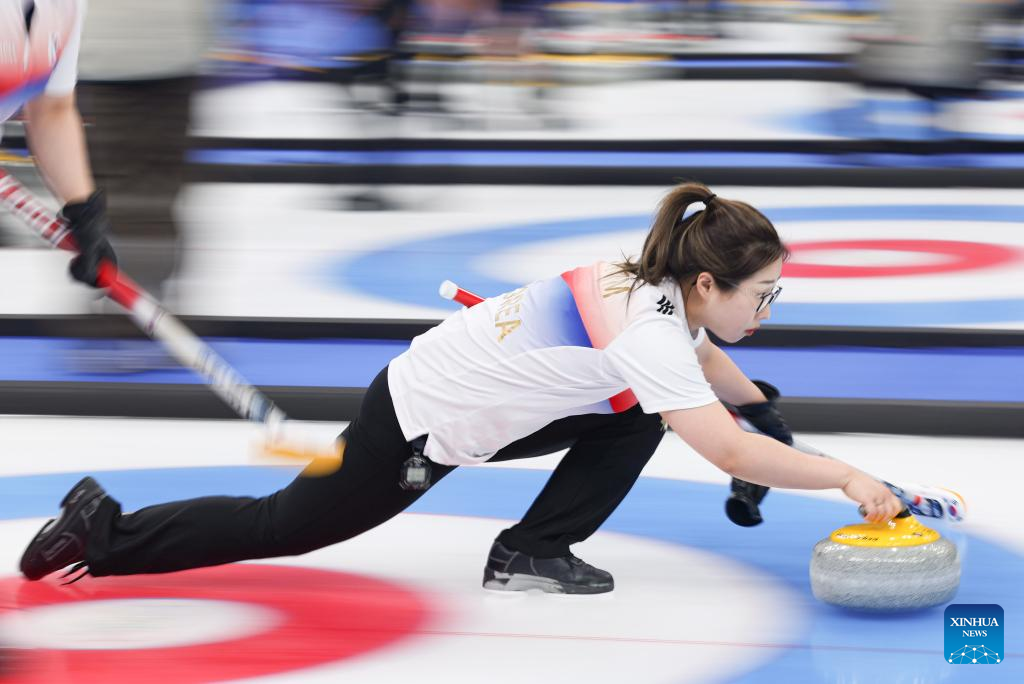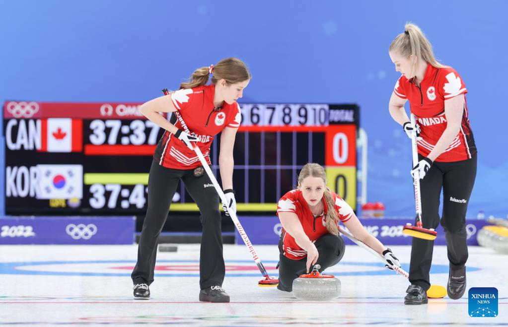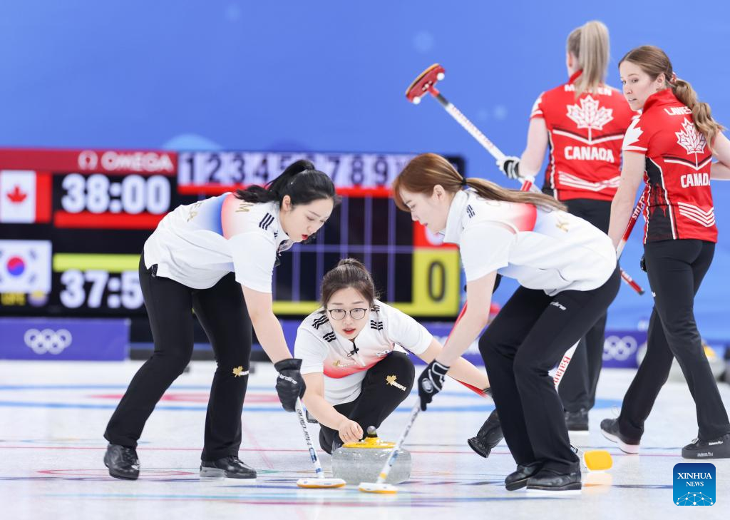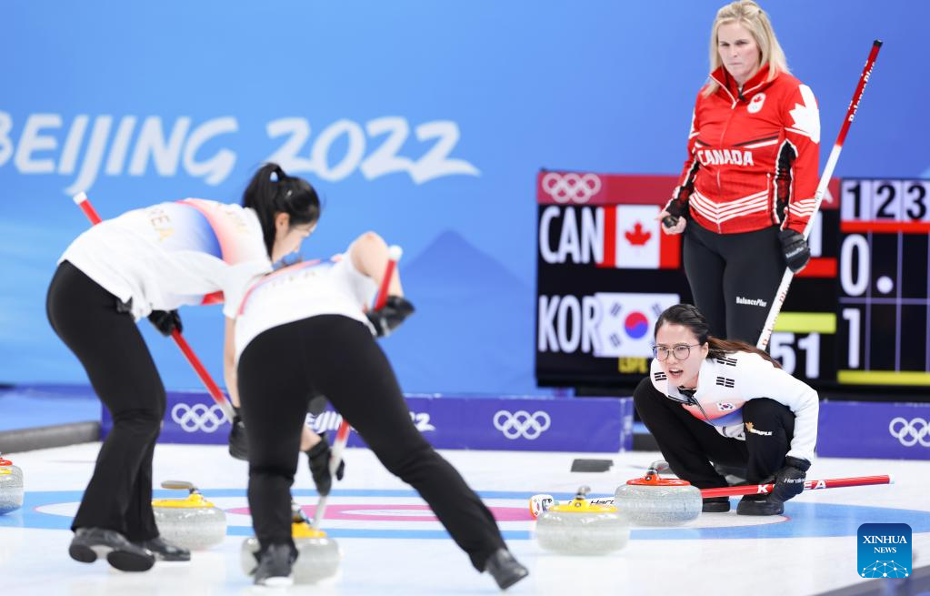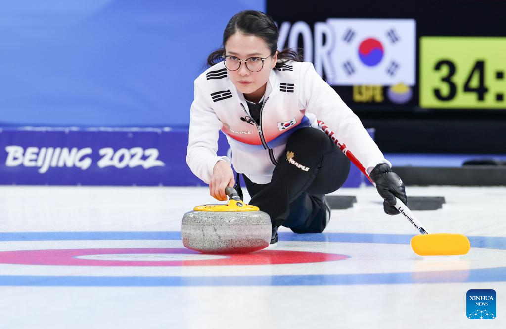 Kim SeonYeong (C) curls the stone during the Curling Women's Round Robin Session 2 of the Beijing 2022 Winter Olympics between Canada and Republic of Korea at the National Aquatics Centre in Beijing, capital of China, Feb. 10, 2022. (Xinhua/Wang Jingqiang)