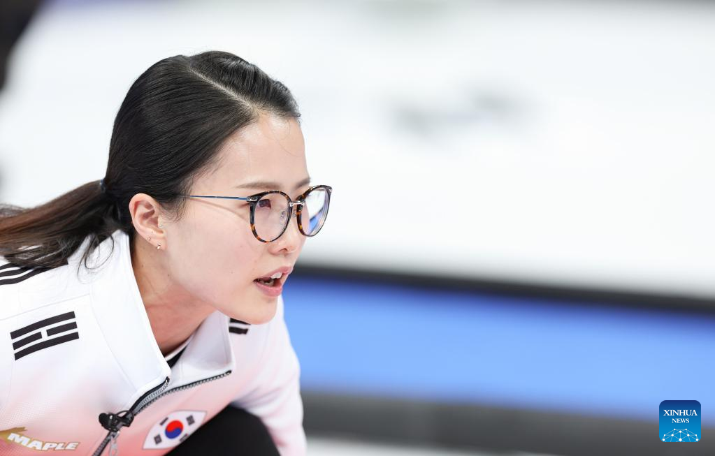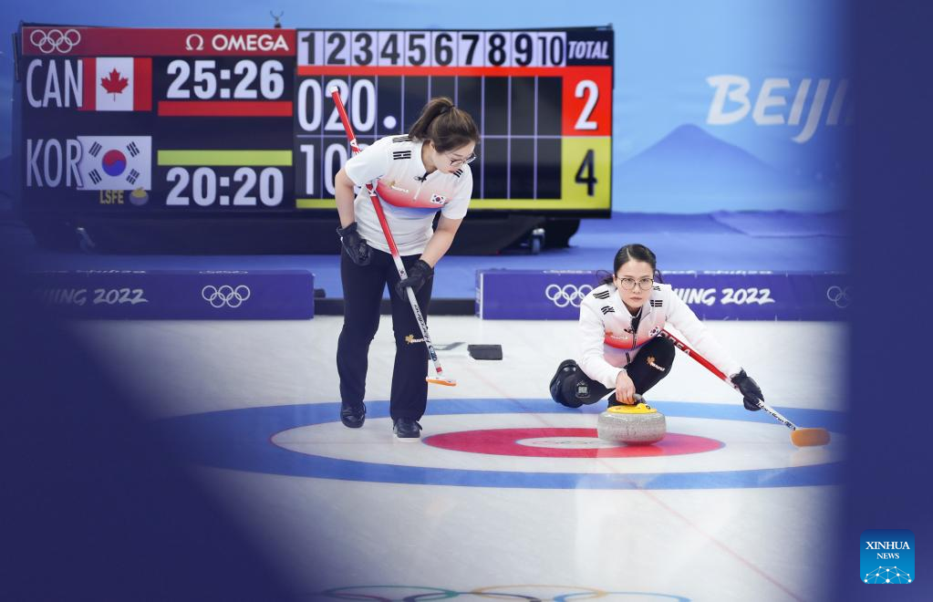 Kim EunJung (R) competes during the Curling Women's Round Robin Session 2 of the Beijing 2022 Winter Olympics between Canada and Republic of Korea at the National Aquatics Centre in Beijing, capital of China, Feb. 10, 2022. (Xinhua/Wang Jingqiang)