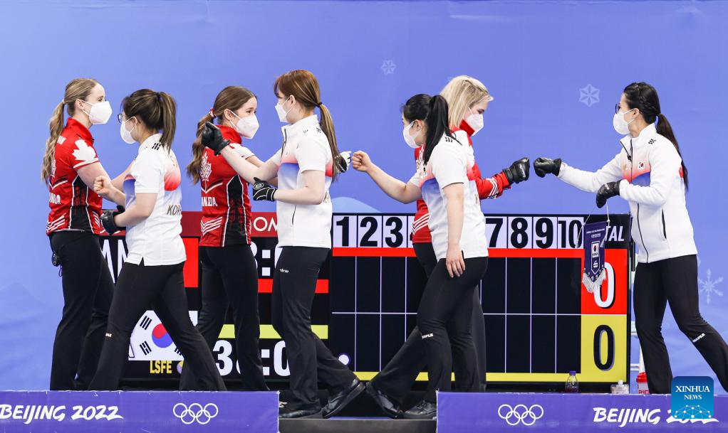 Athletes of Republic Korea greet to athletes of Canada before the Curling Women's Round Robin Session 2 of the Beijing 2022 Winter Olympics between Canada and Republic of Korea at the National Aquatics Centre in Beijing, capital of China, Feb. 10, 2022. (Xinhua/Wang Jingqiang)