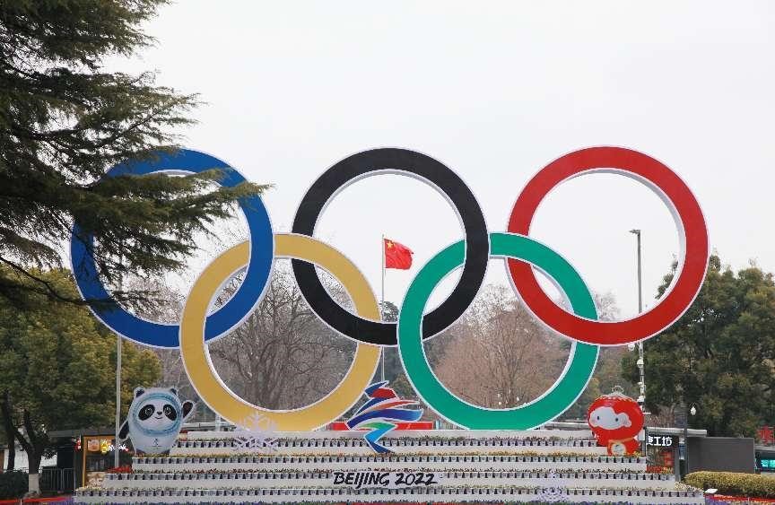 Photo taken on Jan. 29, 2022, shows a decoration featuring the Beijing 2022 at the Xuanwu Lake scenic area, Nanjing city, east China’s Jiangsu province. (People’s Daily Online/ Liu Jianhua)