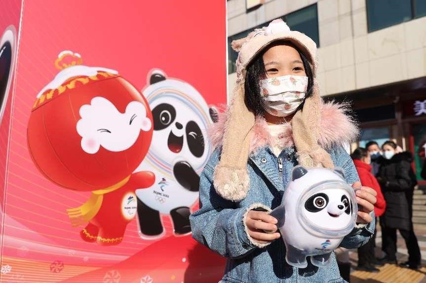 A girl holding a Bing Dwen Dwen doll, the mascot of the Beijing 2022 Olympic Winter Games, poses for a photograph near a store selling Beijing 2022 licensed merchandise on Wangfujing shopping street, Beijing, Feb. 5, 2022. (People’s Daily Online/ Chen Xiaogen)