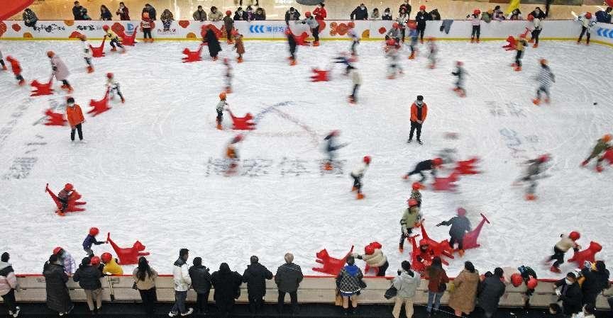 Parents and their kids have fun at an indoor ice rink, which covers an area of about 500 square meters, at an urban complex in Changzhou city, east China’s Jiangsu province, Feb. 6, 2022. (People’s Daily Online/ Xia Chenxi)