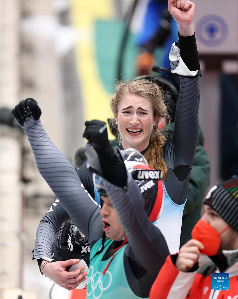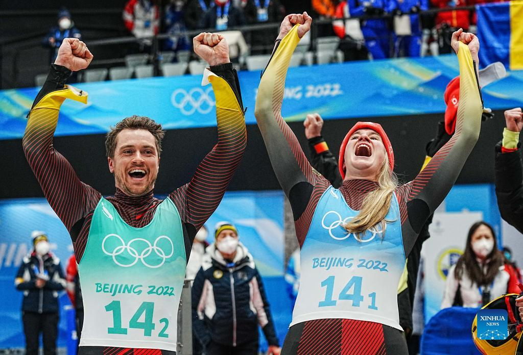 Natalie Geisenberger (R) and Johannes Ludwig of Germany react druing the luge team relay competition at the Yanqing National Sliding Centre in Yanqing district of Beijing, capital of China, Feb. 10, 2022. (Xinhua/Jiang Wenyao)