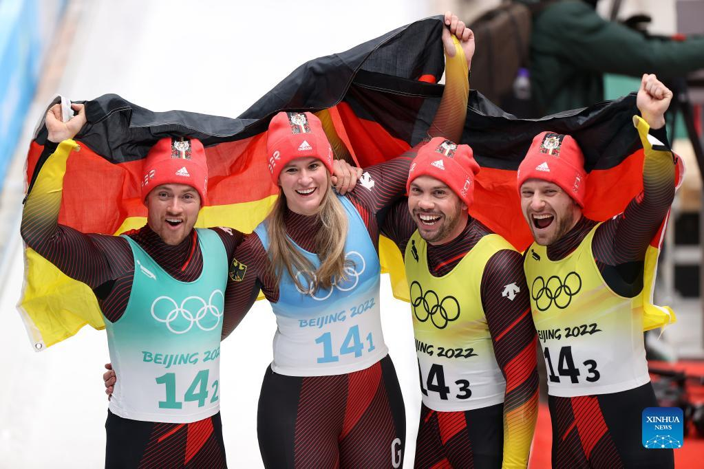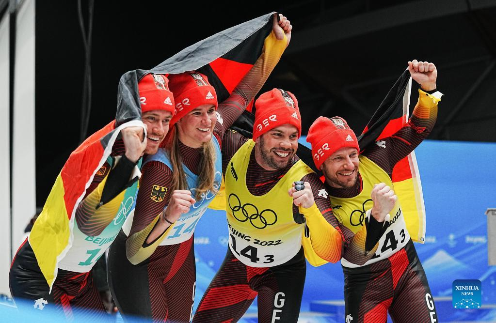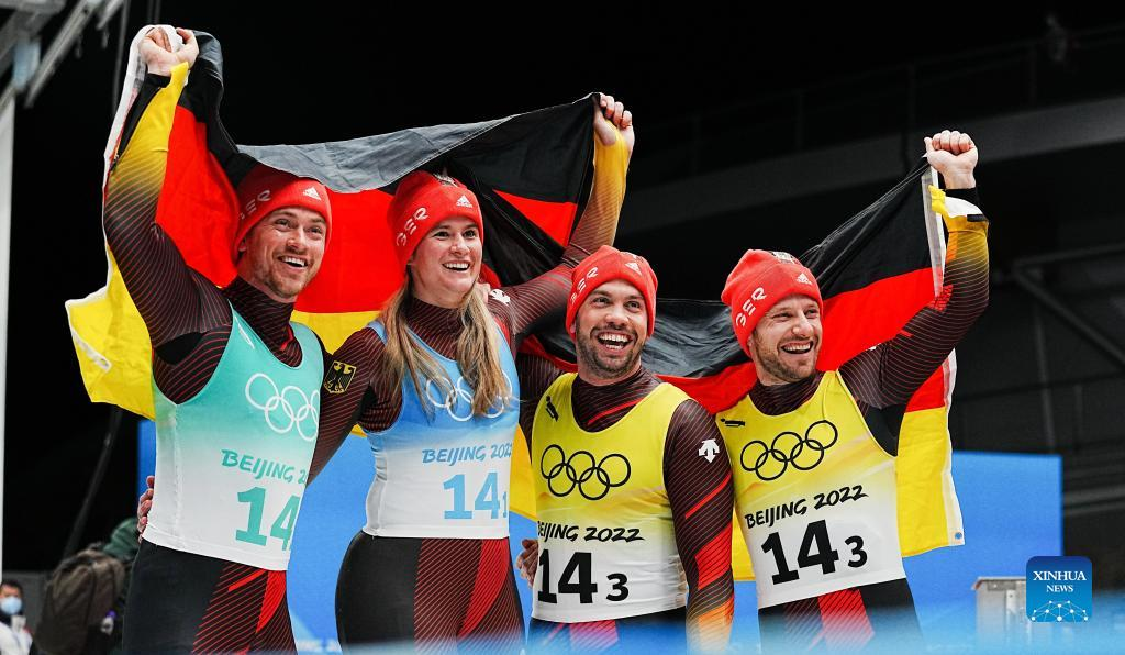 Athletes of Germany celebrate after the luge team relay competition at the Yanqing National Sliding Centre in Yanqing district of Beijing, capital of China, Feb. 10, 2022. (Xinhua/Jiang Wenyao)