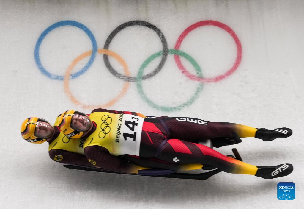 Tobias Wendl/Tobias Arlt of Germany compete during the luge team relay competition at the Yanqing National Sliding Centre in Yanqing district of Beijing, capital of China, Feb. 10, 2022. (Xinhua/Sun Fei)