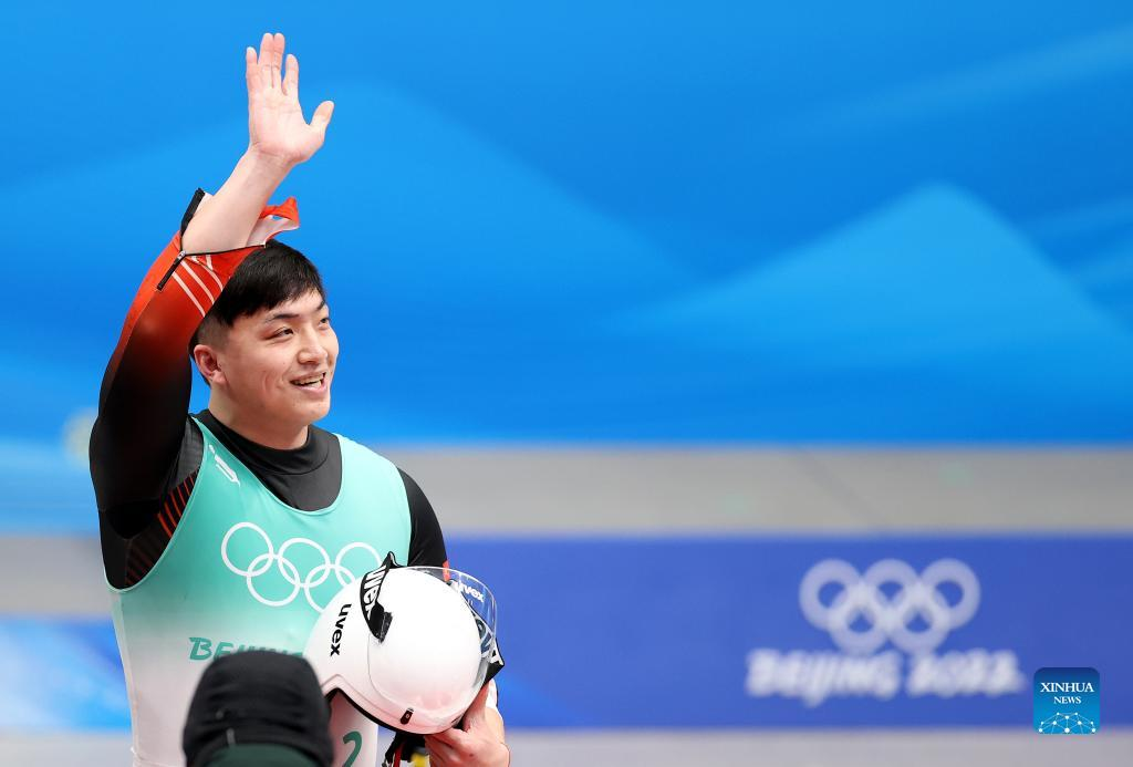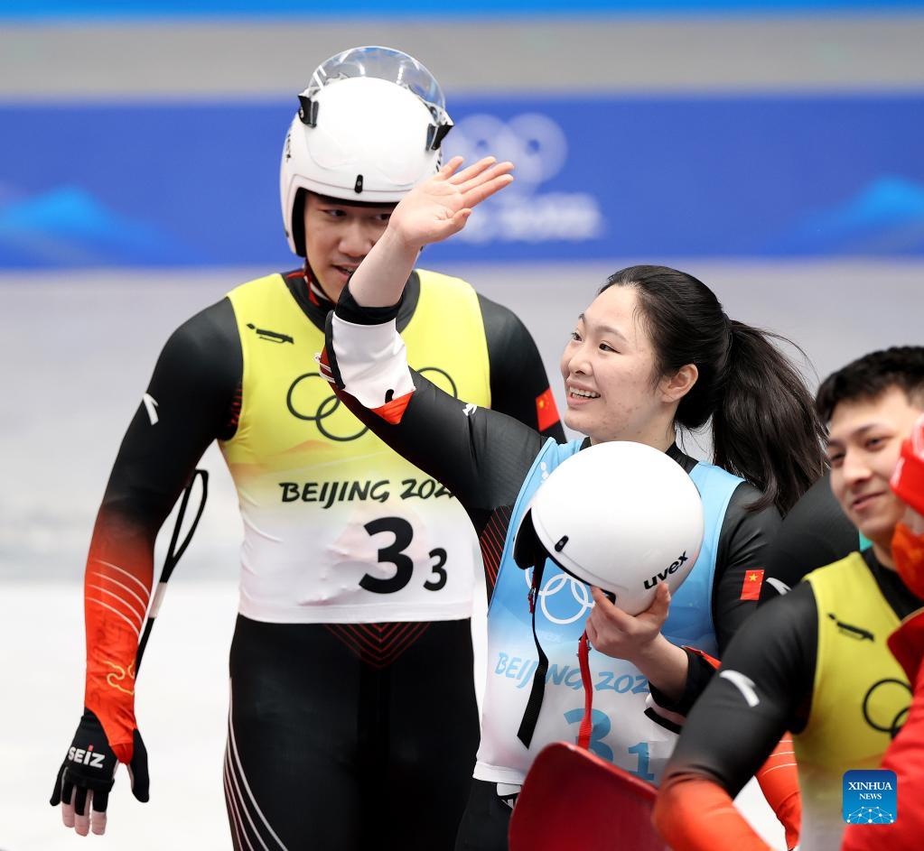 Wang Peixuan of China greets the audience after the luge team relay competition at the Yanqing National Sliding Centre in Yanqing district of Beijing, capital of China, Feb. 10, 2022. (Xinhua/Yao Jianfeng)