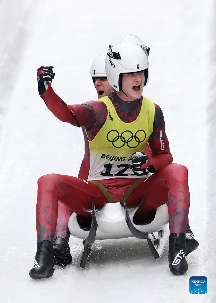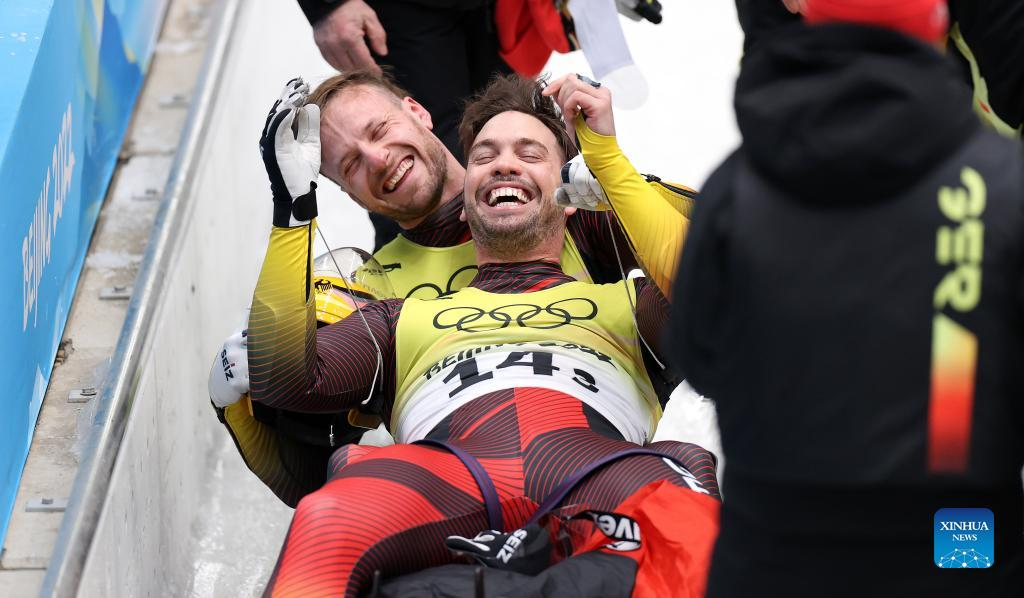 Tobias Wendl/Tobias Arlt of Germany celebrate after the luge team relay competition at the Yanqing National Sliding Centre in Yanqing district of Beijing, capital of China, Feb. 10, 2022. (Xinhua/Yao Jianfeng)