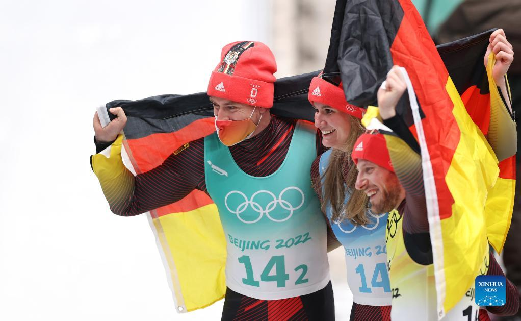 Athletes of Germany celebrate after the luge team relay competition at the Yanqing National Sliding Centre in Yanqing district of Beijing, capital of China, Feb. 10, 2022. (Xinhua/Yao Jianfeng)