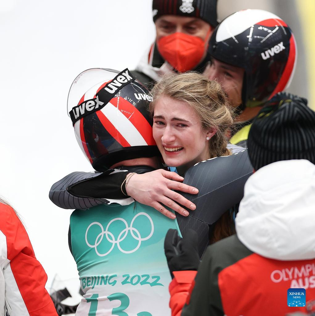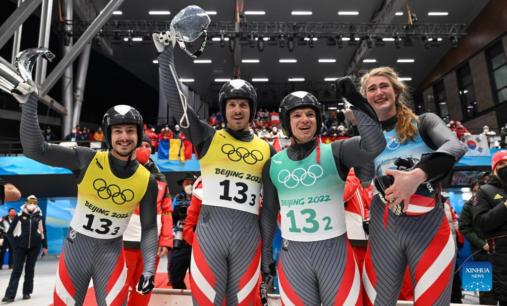 Athletes of Austria celebrate after the luge team relay competition at the Yanqing National Sliding Centre in Yanqing district of Beijing, capital of China, Feb. 10, 2022. (Xinhua/Jiang Wenyao)