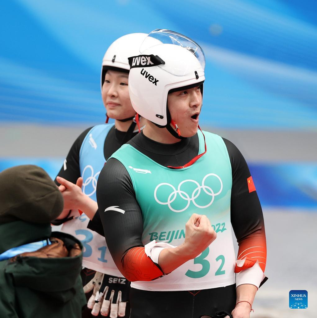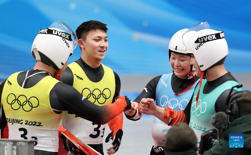 Athletes of China cheer for each other after the luge team relay competition at the Yanqing National Sliding Centre in Yanqing district of Beijing, capital of China, Feb. 10, 2022. (Xinhua/Yao Jianfeng)