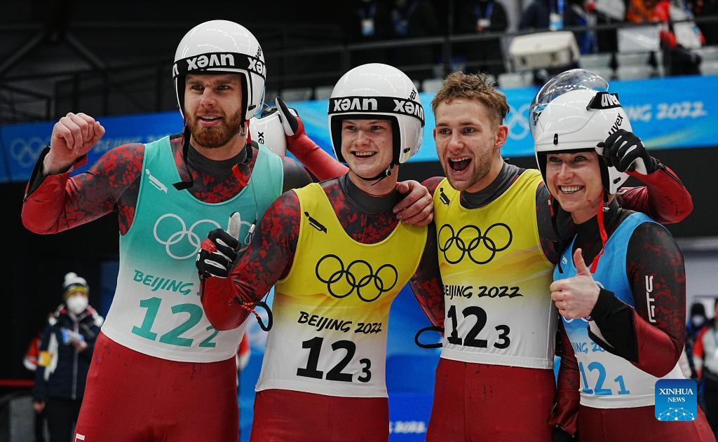 Athletes of Latvia celebrate after the luge team relay competition at the Yanqing National Sliding Centre in Yanqing district of Beijing, capital of China, Feb. 10, 2022. (Xinhua/Jiang Wenyao)