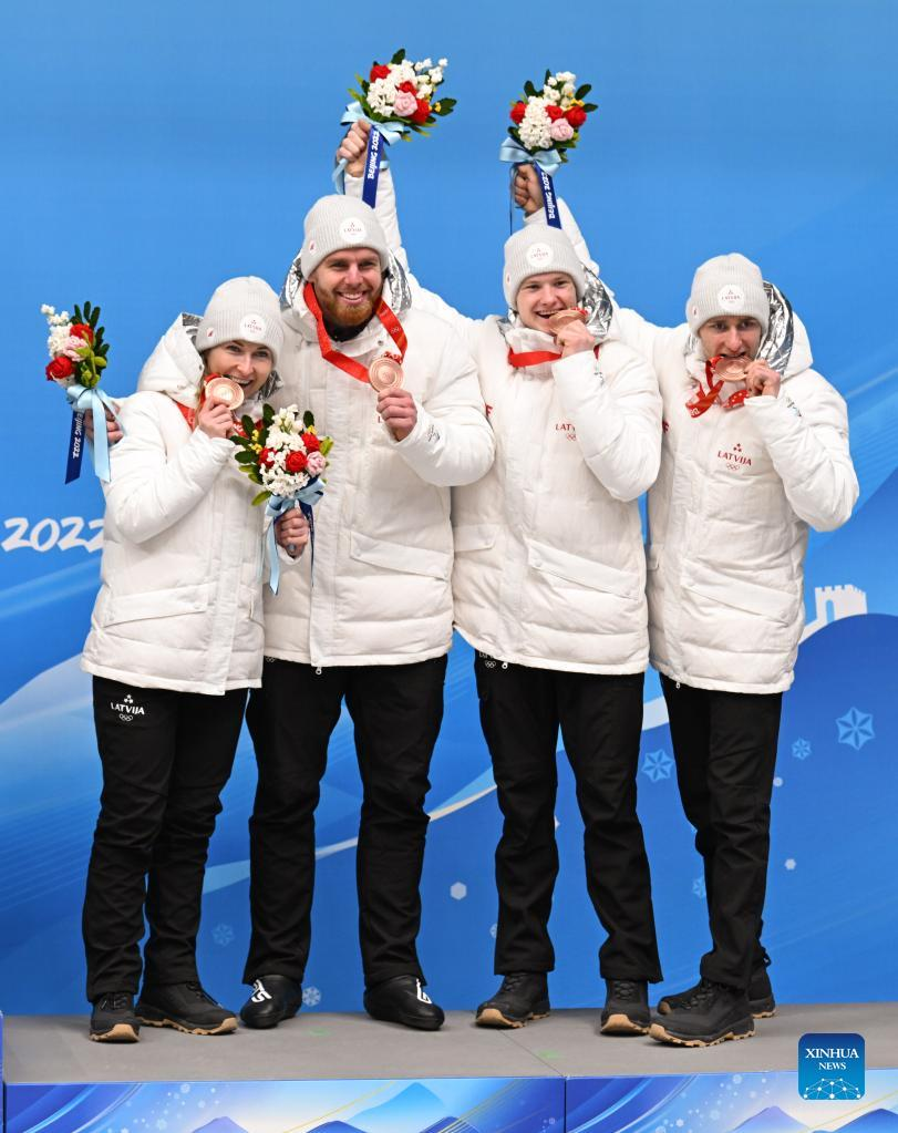 Bronze medalists of team Latvia attend the awarding ceremony after the luge team relay competition at the Yanqing National Sliding Centre in Yanqing district of Beijing, capital of China, Feb. 10, 2022. (Xinhua/He Changshan)