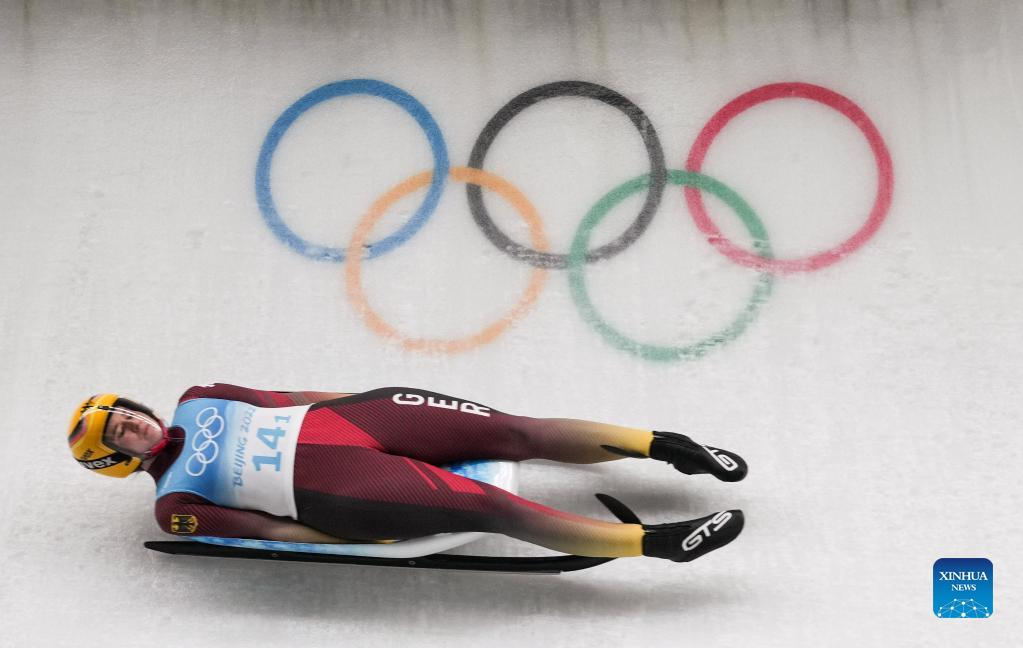 Natalie Geisenberger of Germany competes during the luge team relay competition at the Yanqing National Sliding Centre in Yanqing district of Beijing, capital of China, Feb. 10, 2022. (Xinhua/Sun Fei)