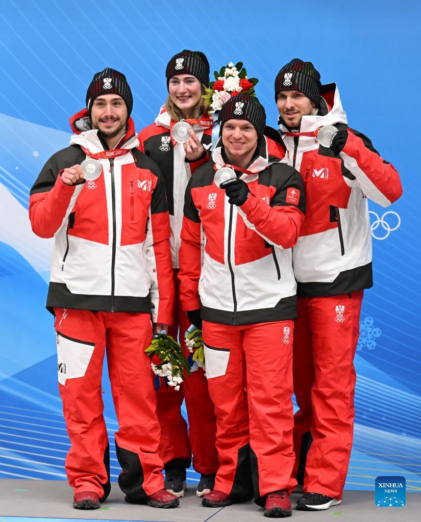Silver medalists of team Austria attend the awarding ceremony after the luge team relay competition at the Yanqing National Sliding Centre in Yanqing district of Beijing, capital of China, Feb. 10, 2022. (Xinhua/He Changshan)