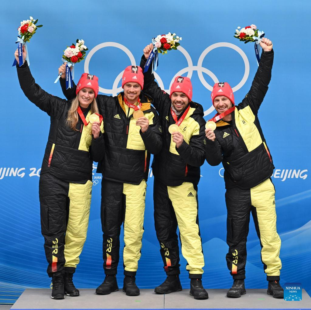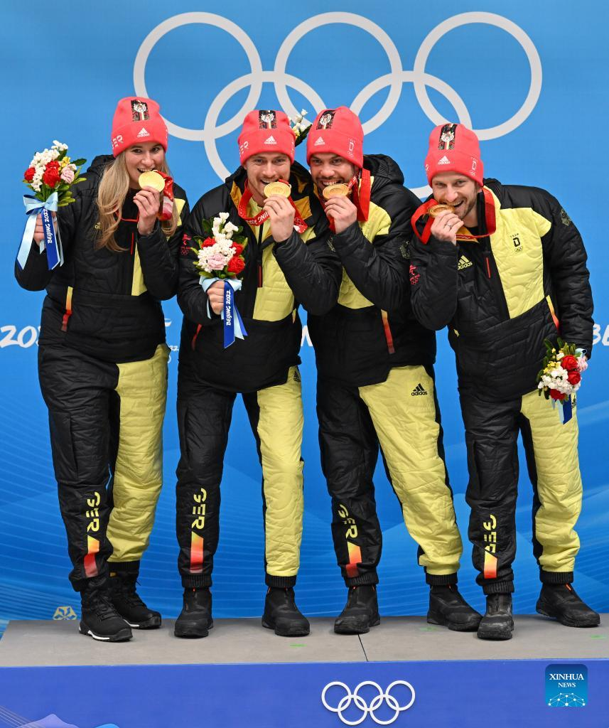 Gold medalists of team Germany attend the awarding ceremony after the luge team relay competition at the Yanqing National Sliding Centre in Yanqing district of Beijing, capital of China, Feb. 10, 2022. (Xinhua/He Changshan)