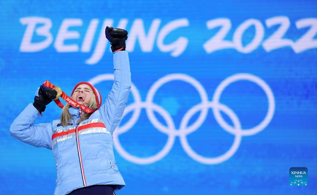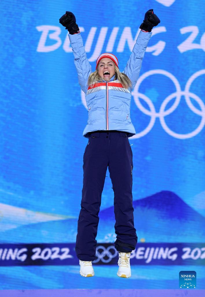 Gold medalist Therese Johaug of Norway reacts during the awarding ceremony of cross-country skiing women's 10km classic at Zhangjiakou Medals Plaza of the Winter Olympics in Zhangjiakou, north China's Hebei Province, Feb. 10, 2022. (Xinhua/Dai Tianfang)