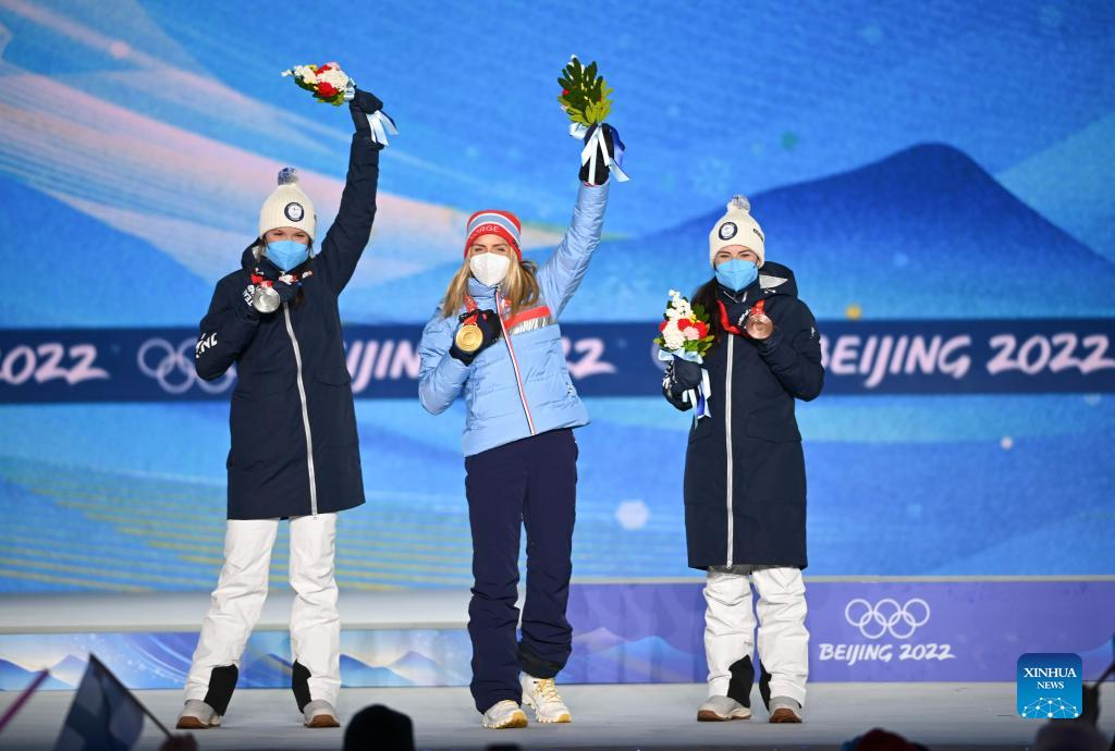 Gold medalist Therese Johaug (C) of Norway, silver medalist Kerttu Niskanen (L) of Finland and bronze medalist Krista Parmakoski of Finland react during the awarding ceremony of cross-country skiing women's 10km classic at Zhangjiakou Medals Plaza of the Winter Olympics in Zhangjiakou, north China's Hebei Province, Feb. 10, 2022. (Xinhua/Feng Kaihua)