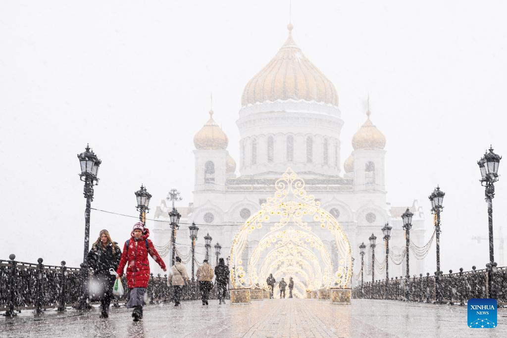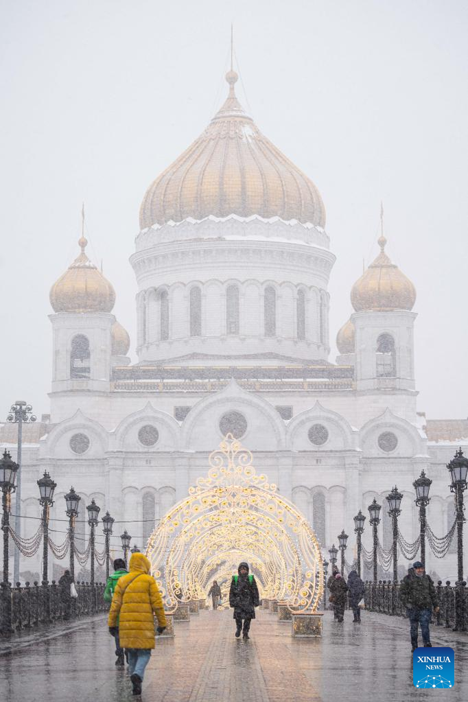 People walk on a bridge near the Cathedral of Christ the Saviour in Moscow, Russia, Feb. 10, 2022. (Xinhua/Bai Xueqi)