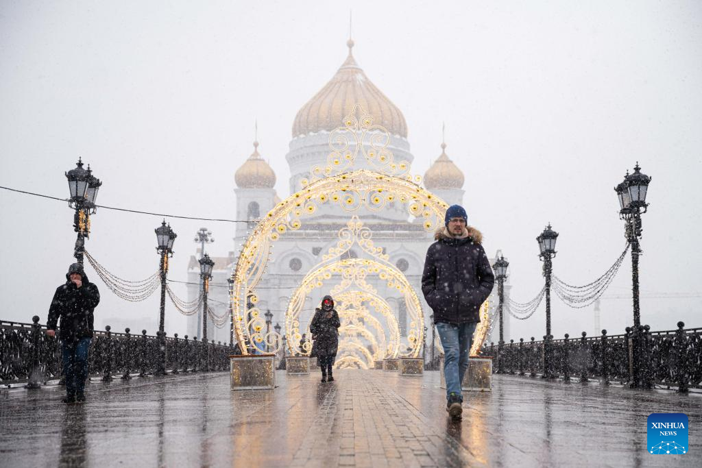 People walk on a bridge in Moscow, Russia, Feb. 10, 2022. (Xinhua/Bai Xueqi)