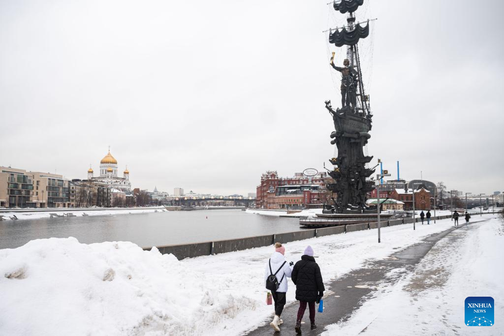 People walk along a river in Moscow, Russia, Feb. 10, 2022. (Xinhua/Bai Xueqi)
