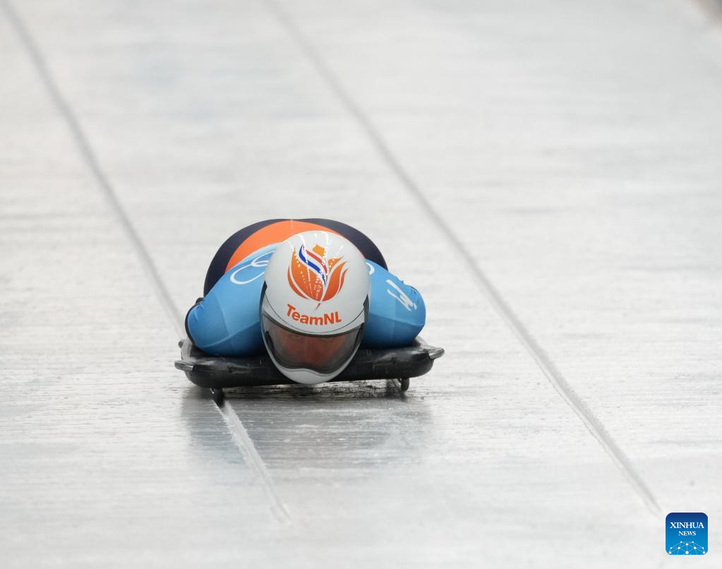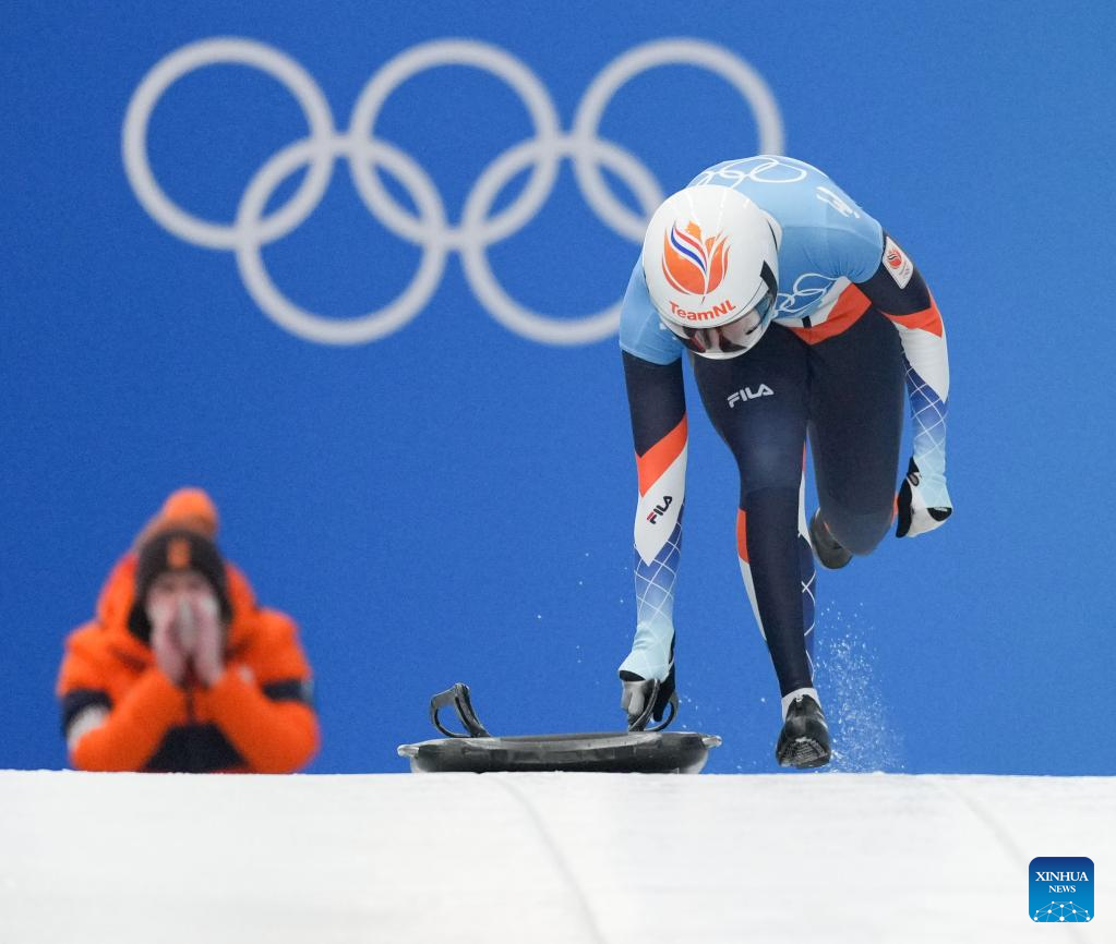 Kimberley Bos of the Netherland competes during skeleton women heat of Beijing 2022 Winter Olympics at National Sliding Centre in Yanqing District, Beijing, capital of China, Feb. 11, 2022. (Xinhua/Sun Fei)