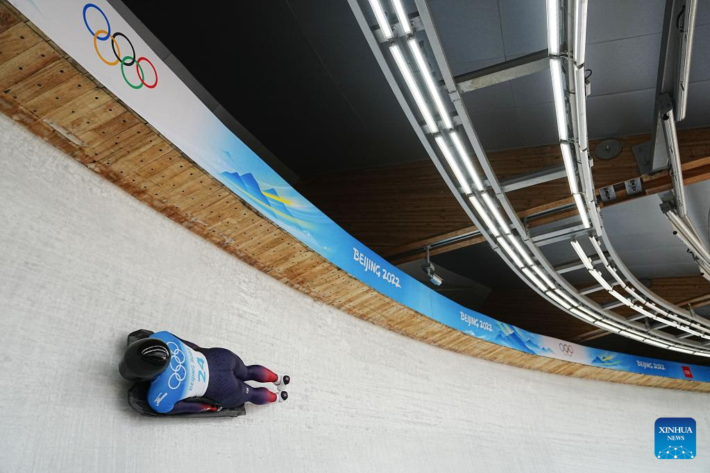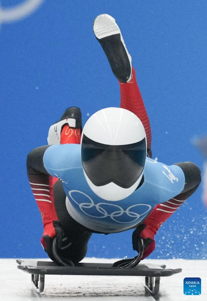 Zhao Dan of China competes during skeleton women heat of Beijing 2022 Winter Olympics at National Sliding Centre in Yanqing District, Beijing, capital of China, Feb. 11, 2022. (Xinhua/Sun Fei)